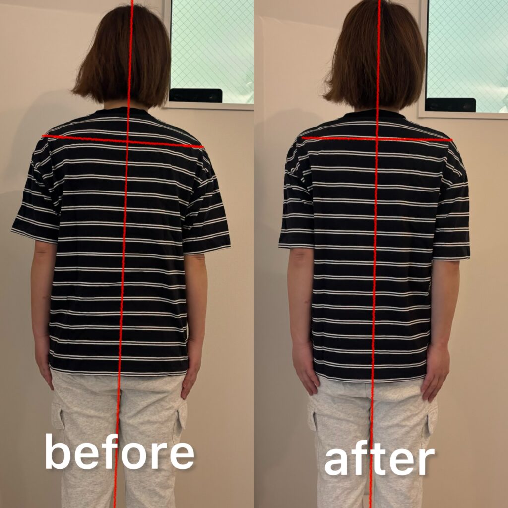 レッスン後には肩の高さはほぼ平行に整い、縦のラインも垂直に近づきました。